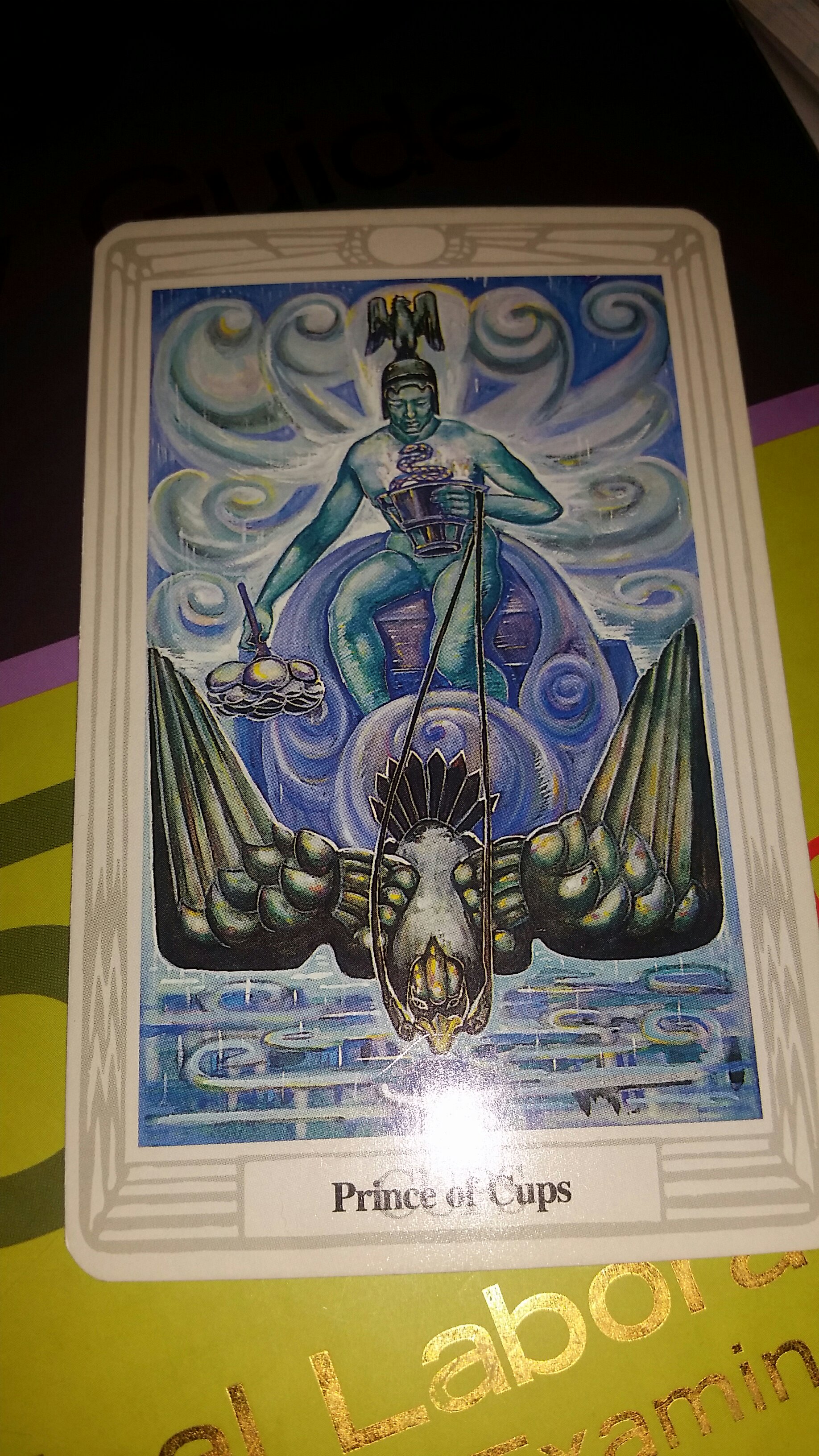 Prince of Cups. Riding that wave of water! I am pretty content, I am in the best position to bring my world exactly where it needs to be. I have the guidance of the hawk to keep me focus. I have the serpent that keeps me on my toes and I can always deal with anything that comes my way. I am water after all, I can run over and make my own way.