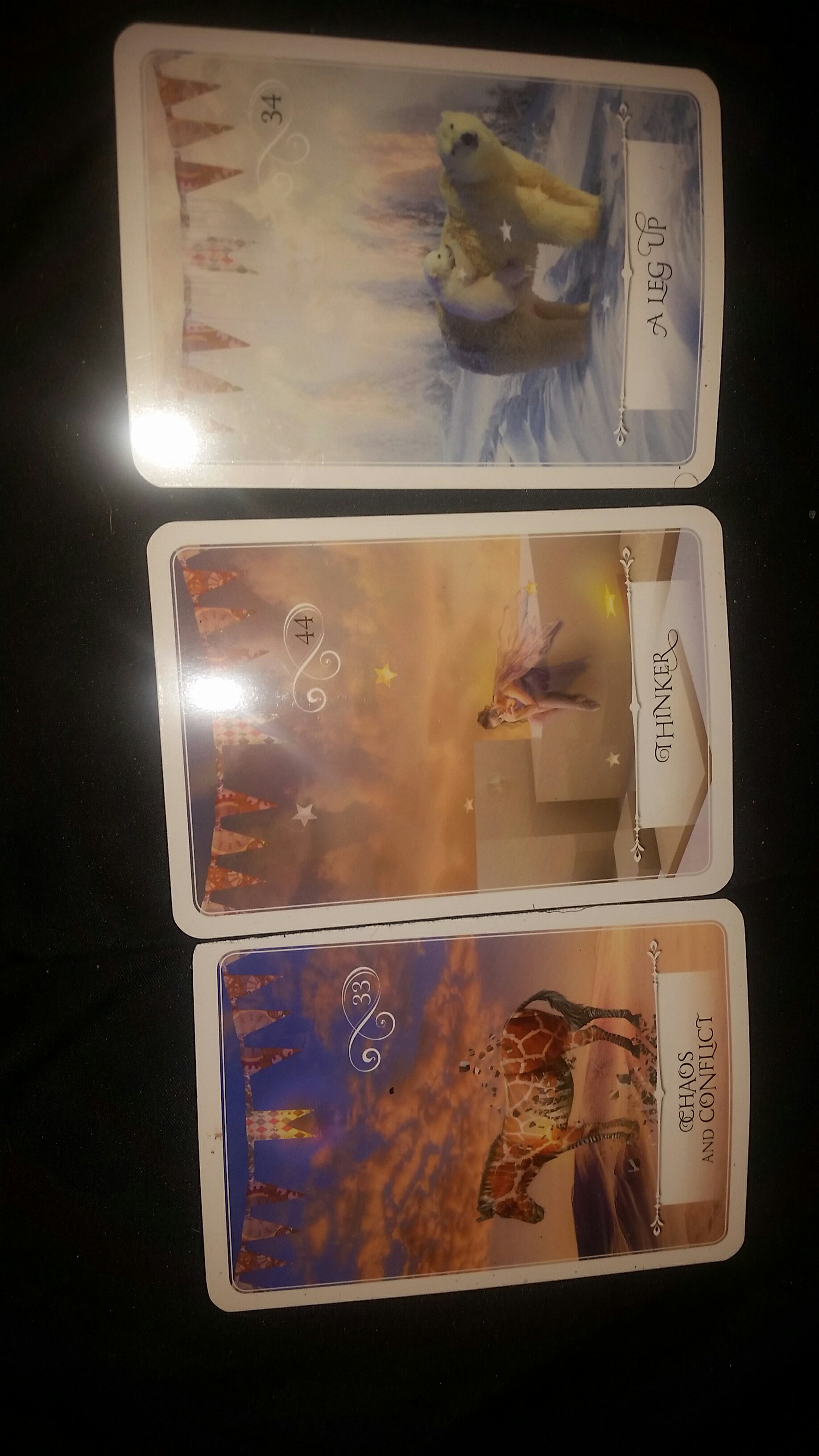 Card draws are A Leg Up, Thinker and Chaos and Conflict all in protection poses. The first one tell me that there is nothing wrong with working with others, they can actually help me move ahead and faster in my goals. Thinker told me to just meditate, breathe and try not to be so in the moment. Everything is a go. The last card just confirmed that with all I have on my plate it is safe to just jump in and grab what slaps me fiest. I’m in a very positive light right now and all favors are good to go.