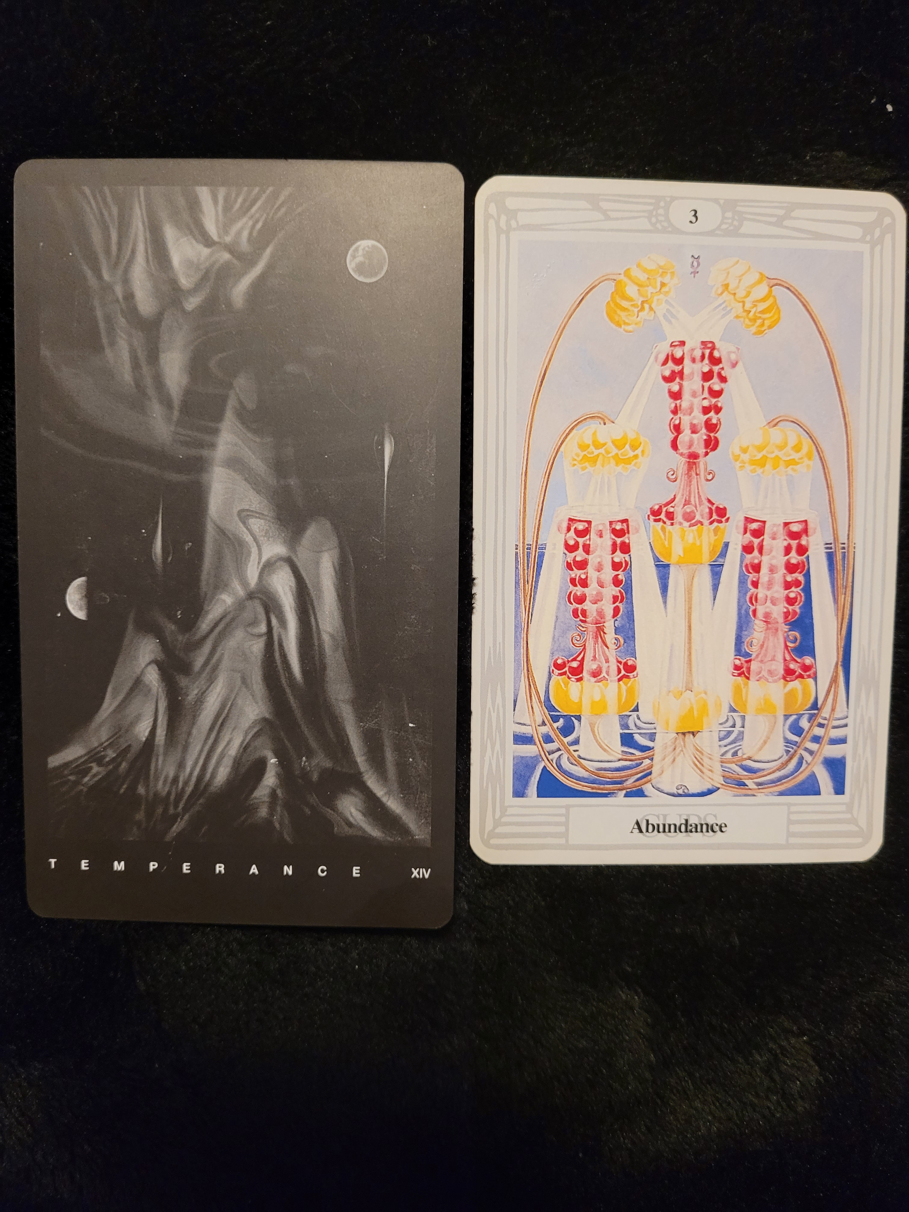 The Temperance Card is see as balance between two similar, almost identical tidal structures. I get peace, relaxation and mysteries just beyond my reach. But I am headed towards that way. The 3 of Cups, Abundance, I see as overflowing with emotions and knowledge. It’s is balance that has been split to give to others in which they come back together to share their experiences with what they were given. So for me these two cards together tell me to balance the community I am in when it comes to knowledge sharing. To look at the mysteries that I hold and share, to help teach and guide people. After all this is what I am here for. Why I am on this planet this go around.