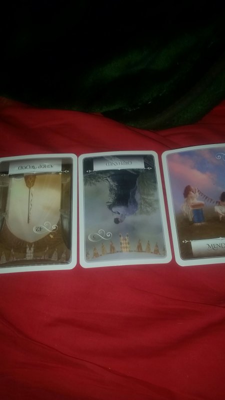 He told me to pull cards 2, 8 and 4. Chop Wood protection pose, Orphaned protection pose, and Mending right side up.