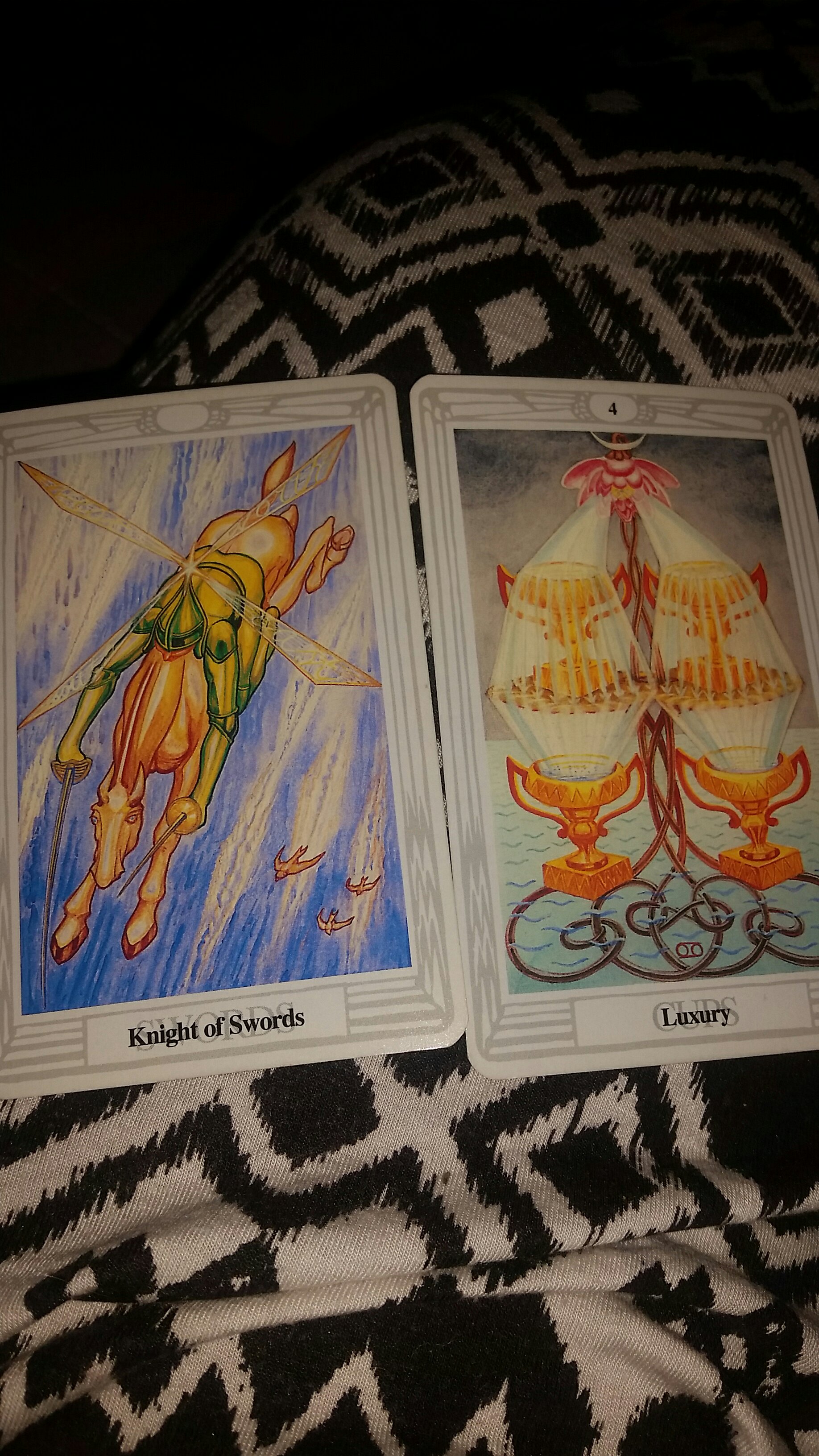 I pulled the Knight of Swords, and 4 of Cups, Luxury. With the KoS I see myself taking on the opportunities that are presenting themselves to me. I have the mental capacity, I have the drive and the fortitude to get shit done. The 4 of Cups is the reward for all my hardworking and continue drive to push forwards through all these speedbumps that I have been tripping over and stumbling for the past few years.